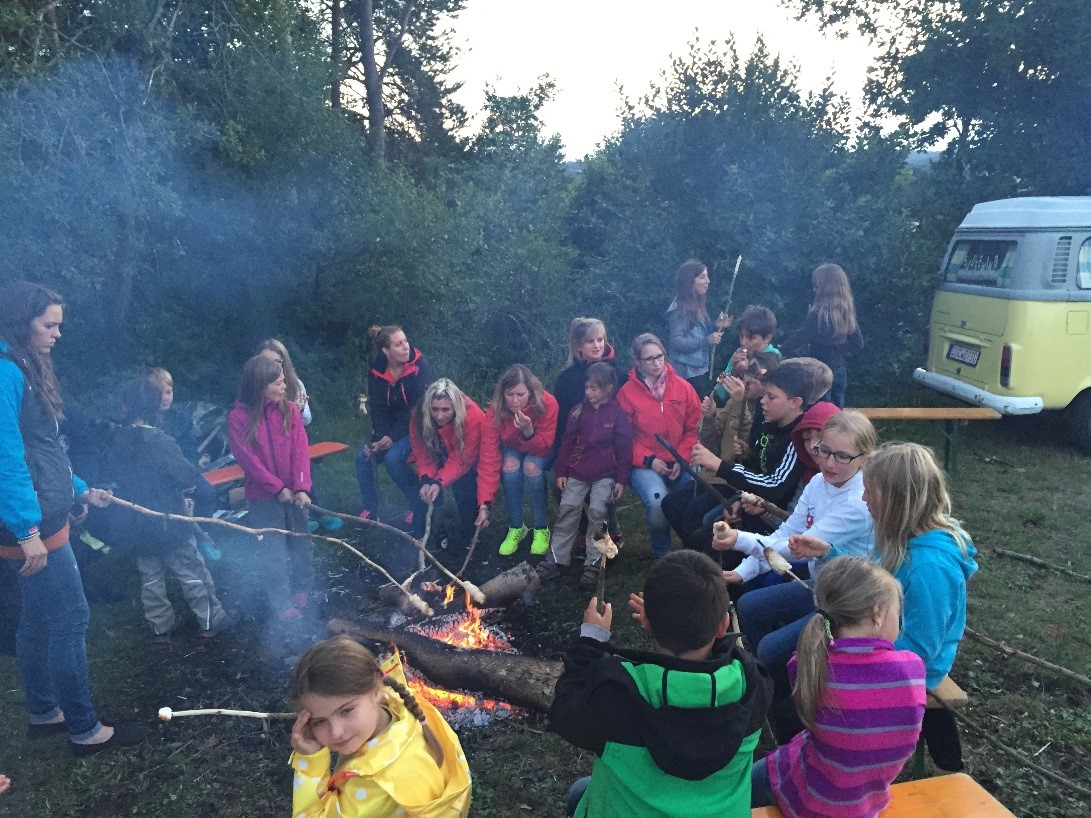 Nach dieser gelungenen Show gab es als Belohnung frisch gebackene Waffeln und anschließend folgte der schon den ganzen Tag heiß ersehnte Aufbau der Zelte. Mit dem Einbruch der Dämmerung wurde das Lagerfeuer entfacht, das zu einer gemütlichen, geselligen Runde mit Bratwürstchen, Stockbrot, Marshmallows und natürlich vielen Witzen und spannenden Geschichten einlud.